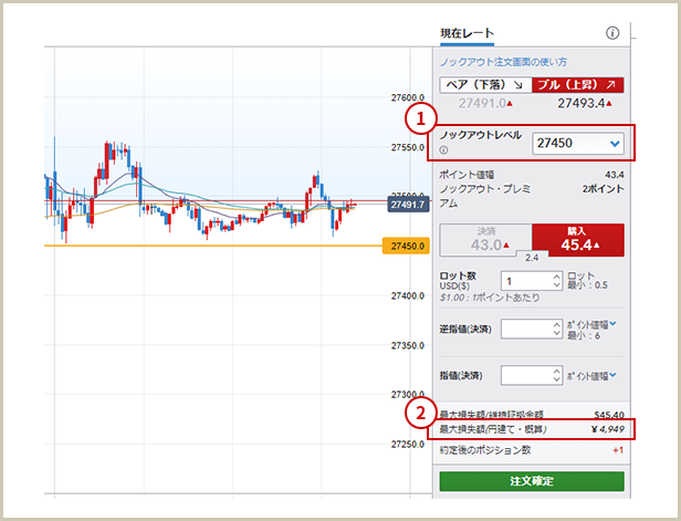 少額でノックアウトオプションのNYダウとFXを取引してみました!!実際ノックアウトオプションの株価指数(NYダウ)を取引してみました。NYダウが上昇すると予想し、ノックアウトオプションの株価CFDのNYダウ=27,493.40ドルでブル(上昇)の注文を発注しました。チャートを見ると27,490ドル付近にサポートがあるので27,450ドルにノックアウトレベル(損切りライン)を設定[下図①]しました。この場合の必要な投下資金(オプション購入金額)は、ノックアウトレベル(=最大損失額)の4,949円のみ[下図②]となります。ノックアウトオプションの場合、通常の株価指数CFDやFXのような必要証拠金は必要ありませんので、非常に高い資金効率で取引が可能です。