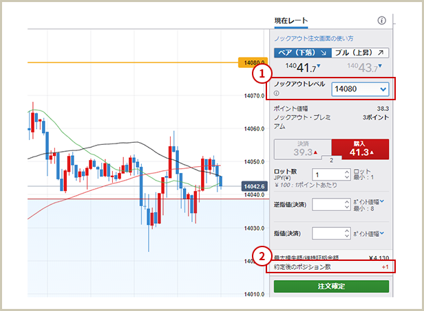 またノックアウト・オプションのFXでポンド/円を取引きしてみました。チャートを見ると移動平均線の短期線が中期、長期線を下に抜けそうになっています。今後下落すると予想し、ポンド/円=140.417円でベア(下落)の注文を発注しました。念のため予想が外れて上昇した場合にそなえ、前回の高値140.70の上のレベル140.80円にノックアウトレベル(損切りライン)を設定[下図①]しました。この場合の必要な投下資金(オプション購入金額)は、ノックアウトレベル(=最大損失)の4,130円のみ[下図②]となります。