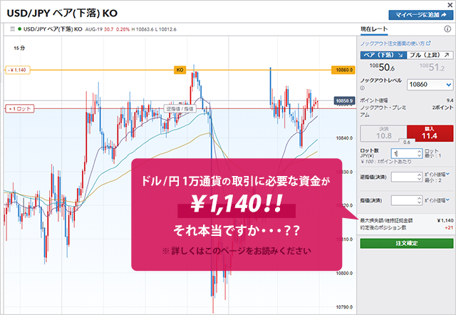 ノックアウトオプションは少額から始められる!その資金効率は?ノックアウトオプションはなぜFXより少額から取引が可能なのか?それを理解するため、ノックアウトオプションのオプション購入金額とFXの証拠金額の計算例を用いながら比較してみます。なおノックアウトオプションはオプションの一種でFXとは異なるため、ノックアウトオプションの資金効率を説明する際、FXでいうところのレバレッジという言葉は使用しません。